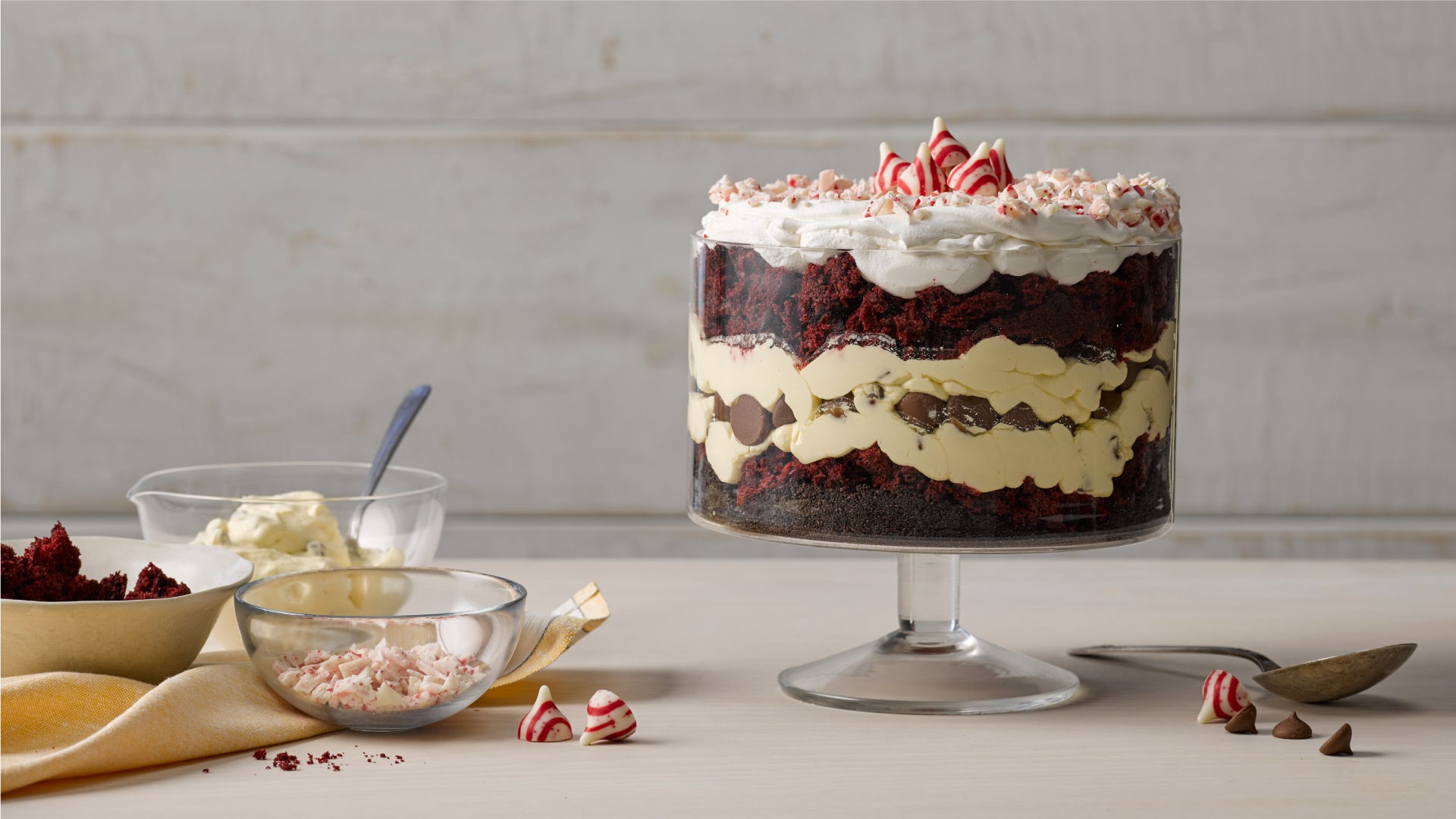 Trifle is a dessert made with layers of sponge cake, custard and cream. This holiday trifle features luscious cheesecake pudding sandwiched between rich red velvet cake. Top it off with a light-as-air whipped topping and some peppermint candy to boot.