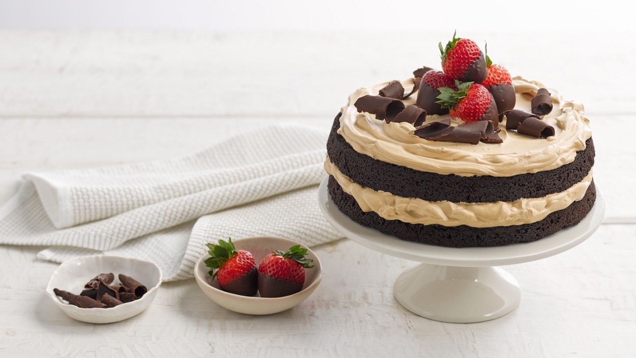 Your mocha-loving Valentine will feel so special when you serve them this cake. Layers of dense fudge cake and creamy coffee filling make for one dazzlingly decadent dessert. Top it all off with chocolate curls and chocolate-covered strawberries. Voila!
